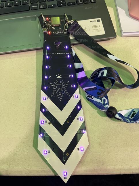 I must emphasize just how amazing the badges were, nothing short of spectacular. Designed in the shape of a tie to reflect this year’s ‘evil corporation’ theme, the badges were embedded with an ESP32. Intriguingly, they contained several hidden flags, four of which remained undiscovered by any team!